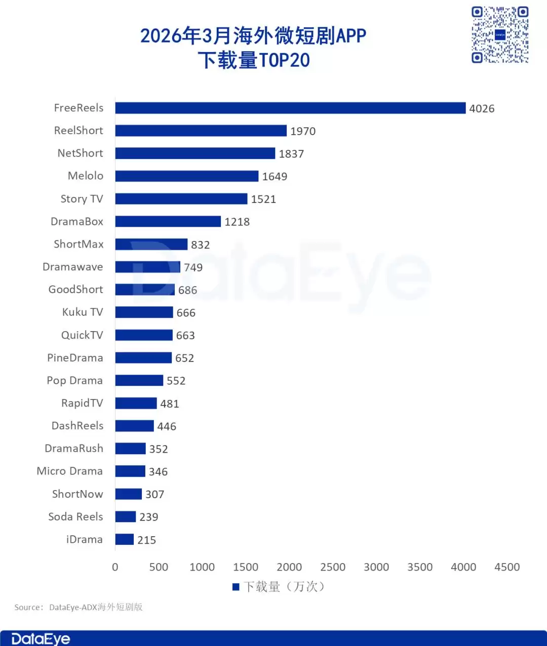 具体到应用层面,竞争格局同样充满看点。在2026年3月海外微短剧APP下载量TOP20榜单中,昆仑万维旗下的FreeReels继续稳坐头把交椅,单月下载量突破4000万次,与上月基本持平,形成了断崖式的领先优势。ReelShort和NetShort则分列第二、三位,下载量均超过了1800万次。