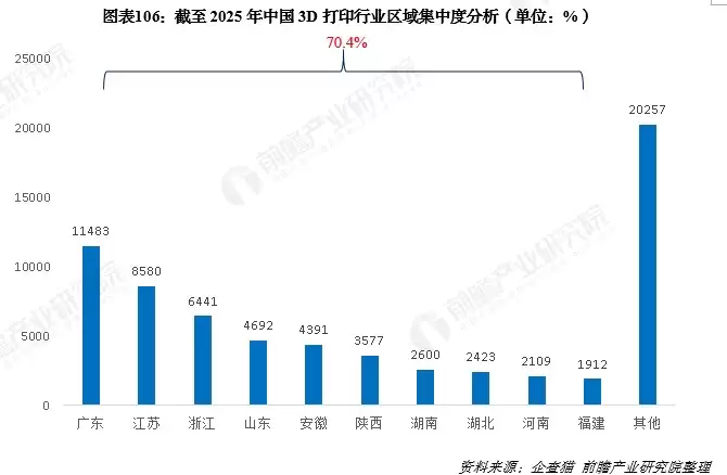 从企业分布来看,截至2025年4月,广东、江苏、浙江、山东等前十省份的3D打印企业数量合计占全国总量的70%以上。其中,仅广东省一省就占据了全国约25%的份额,产业集中度可见一斑。