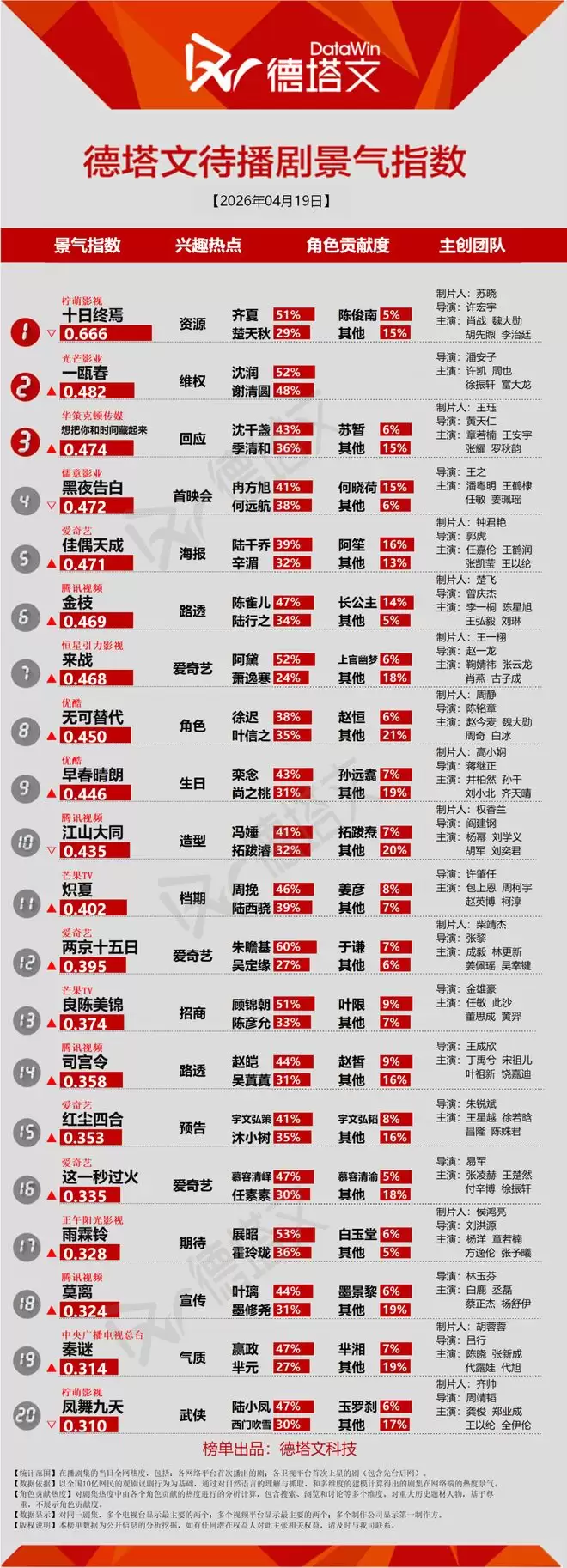 十日终焉(齐夏51% 楚天秋29%) 一瓯春(沈润52% 谢清圆48%) 想把你和时间藏起来(沈千盏43% 季清和36%) 黑夜告白 佳偶天成 金枝 来战 无可替代 早春晴朗 江山大同 炽夏 两京十五日 良陈美锦 司宫令 红尘四合 这一秒过火 雨霖铃 莫离 秦谜 凤舞九天