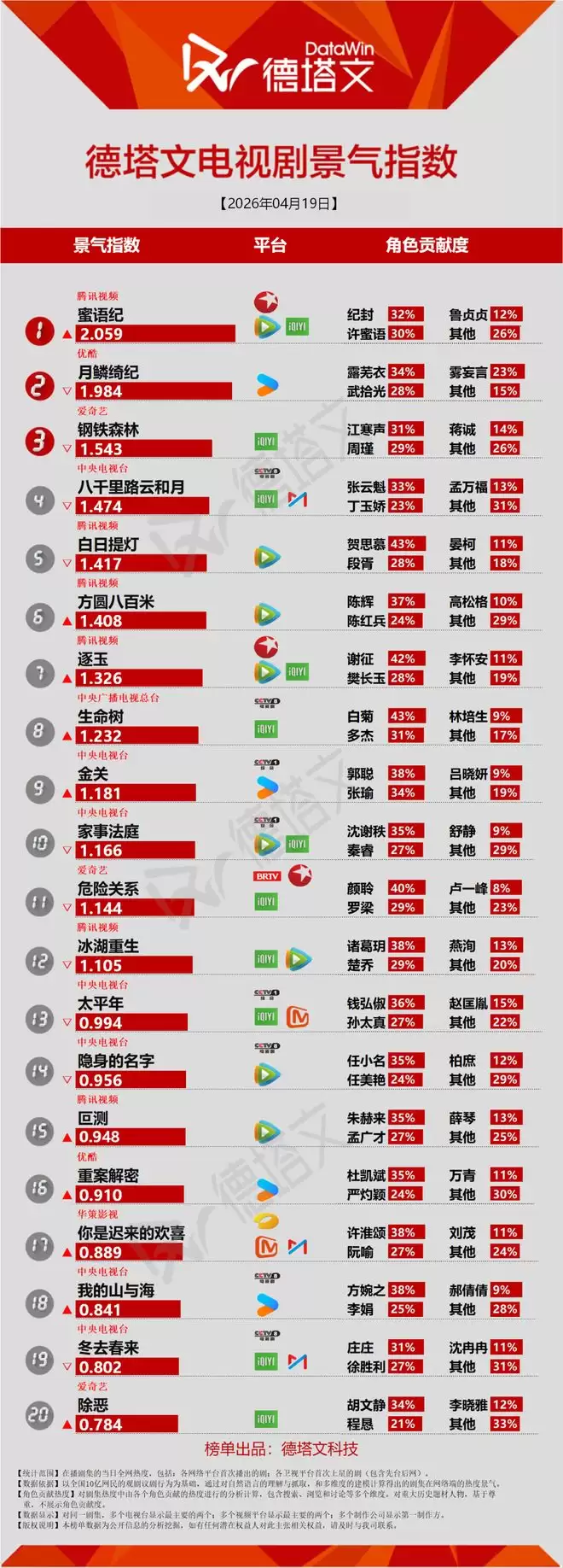 蜜语纪(纪封32% 许蜜语30%) 月鳞绮纪(露芜衣34% 武拾光28%) 钢铁森林(江寒声31% 周瑾29%) 八千里路云和月 白日提灯 方圆八百米 逐玉 生命树 金关 家事法庭 危险关系 冰湖重生 太平年 隐身的名字 叵测 重案解密 你是迟来的欢喜 我的山与海 冬去春来 除恶