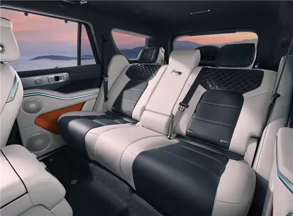 座椅配置更是堪称“奢华”。前排座椅支持高达20向的电动调节,后排则能实现141°的无极电动调节,甚至前排靠背可以完全放平至180°。全车座椅均配备了通风、加热功能,以及多达10点位、3层气袋的按摩系统,长途穿越的舒适性有了质的保障。