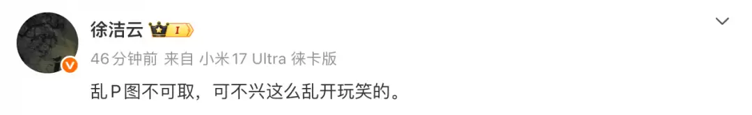面对这场突如其来的网络狂欢,小米方面很快有了反应。小米集团董事长特别助理、战略市场部副总经理徐洁云疑似在微博作出了回应,他的表态相当直接:“乱P 图不可取,可不兴这么乱开玩笑的。” 这短短一句话,算是给这则沸沸扬扬的传闻泼了一盆冷水。