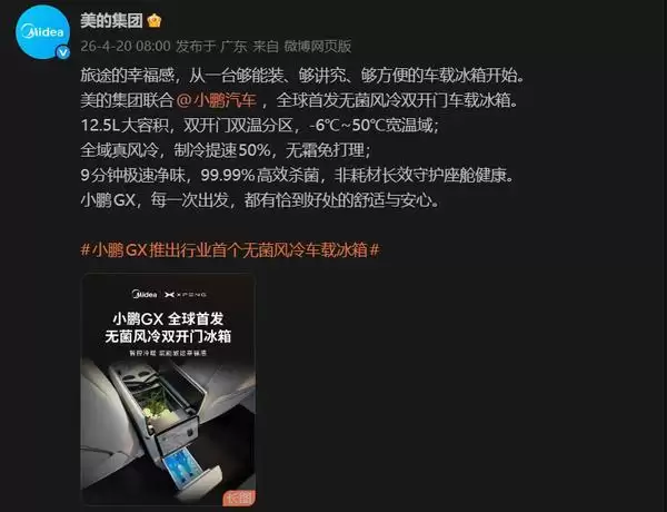 车载冰箱市场,最近迎来了一款堪称“王炸”级的新品。4月20日,美的集团与小鹏汽车联手,正式推出了全球首款无菌风冷双开门车载冰箱。这不仅仅是两个品牌的简单合作,更像是一次对传统车载存储体验的彻底革新。
