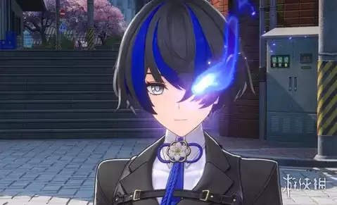 造型:黑蓝渐变的短发特意遮住右眼,左眼则烙印着醒目的蓝色火焰状异能纹。一身黑色立领制服配以银色扣饰,下着深色长裤与过膝长靴,腰间是标志性的双刀挂架。