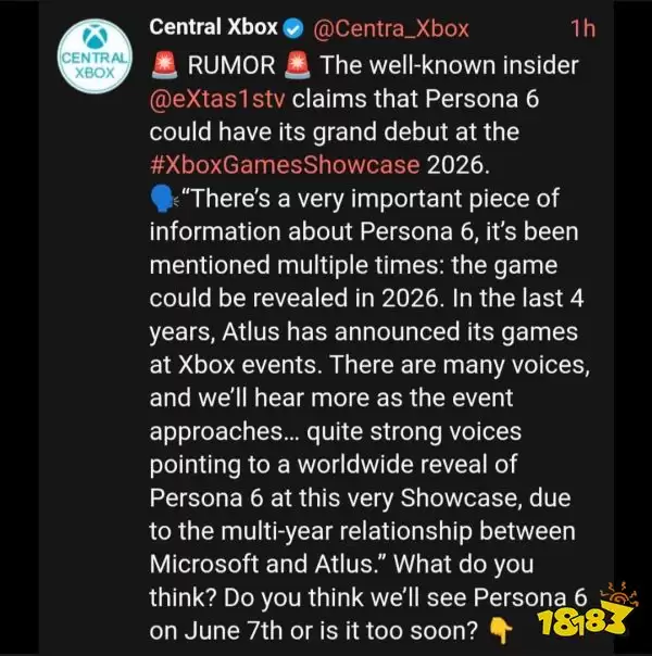 这可不是空xue来风。Extas1s给出的理由,听起来颇有几分道理:看看最近四年,Atlus这家公司似乎“偏爱”在Xbox的舞台上发布重磅消息。再加上微软与Atlus之间那持续多年的战略合作,种种迹象叠加起来,指向了一个“相当强烈的信号”——没错,那个无数玩家魂牵梦绕的《P6》,极有可能就在那里揭开面纱。