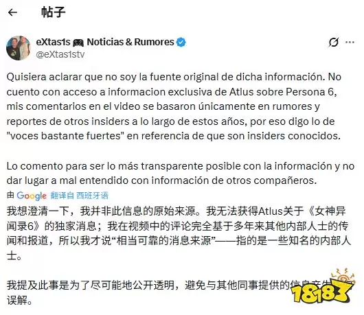 当然,爆料过后,Extas1s也很快进行了补充说明。他澄清自己并非这条信息的“源头”,他的判断,其实是综合了多年来各路内部人士的传闻与行业报道后,做出的一个推测。他特意强调,这么做是为了保持信息的透明度,避免大家产生误解。话说回来,这种操作在业界也算不上新鲜事,毕竟,此前世嘉就曾在Xbox的展会上,隆重推出过《女神异闻录3:重制版》。