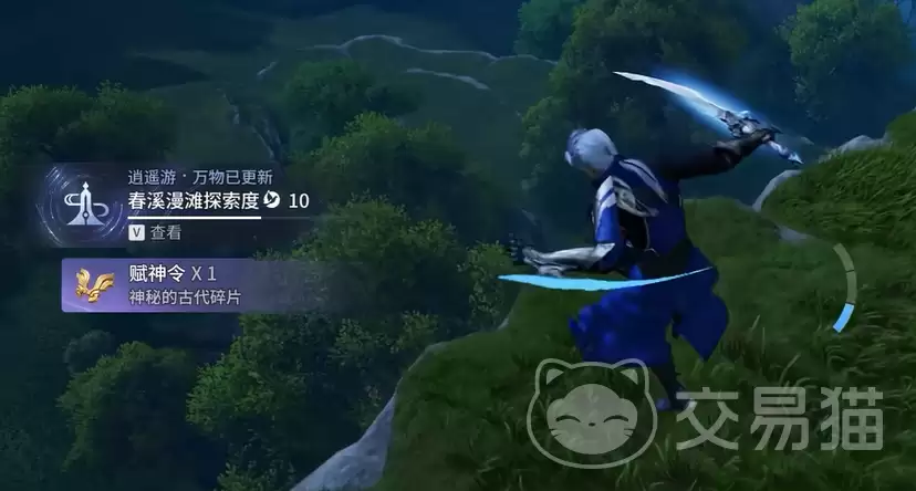 操作上有个小诀窍:起始时先向右移动,稳稳站在第一块石板上,它会缓缓升起。跳到第二平台后,别忘了用余光留意侧方河道里游动的灵体。后续就需要钩索出场了,瞄准浮空的石板连续飞跃两段,最终平台上的第二、第三枚赋神令便触手可及。全部拾取后,记得右转跳上对岸平台开启宝箱,至此,这个探秘点才算圆满收官。