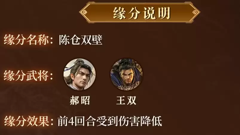说到缘分搭配,那就不得不提王双了。这对组合直接还原了历史上陈仓之战的守城搭档。当郝昭与王双同队出场时,能为我方全体带来一个强力的开场Buff:前4回合受到的伤害降低12%。开局阶段的减伤,其战略价值有多高,实战过的朋友都懂。此外,郝昭还拥有专属韬略【陈仓壁垒】,效果是在释放战法时,让目标身上的谋略伤害降低效果延长1回合。这无疑是给整个队伍的“法术防御墙”又加厚了一层。