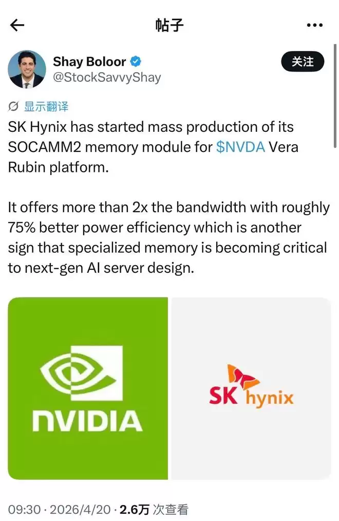 行业近期迎来一项关键进展。4月20日,根据美国市场策略师Shay Boloor披露的信息,SK海力士已开始为英伟达Vera Rubin平台大规模量产SOCAMM2内存模块。这一方案实现了带宽的翻倍提升,同时将功耗效率优化了约75%。它清晰地指向一个结论:专用缓冲内存正成为决定下一代AI服务器性能与效率的核心组件。