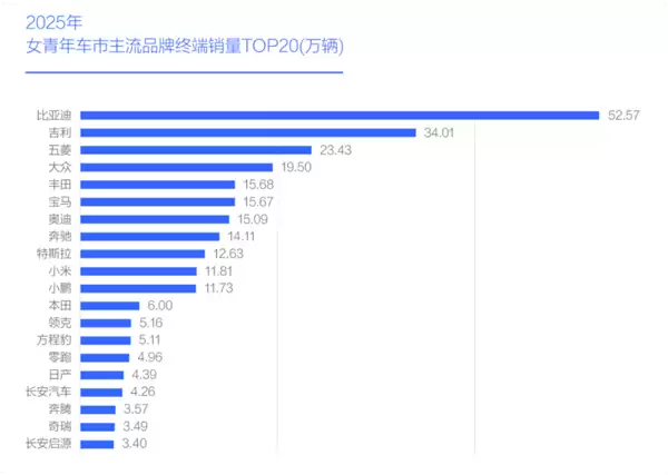 2025年,在年轻女性消费者中最受欢迎的三大品牌,分别是比亚迪、吉利和五菱。以吉利为例,凭借星愿、熊猫这类精准定位的小型电动车,一年就从女性用户手中斩获了34万辆的销量,这个成绩甚至让大众、丰田、本田等传统海外巨头都望尘莫及。