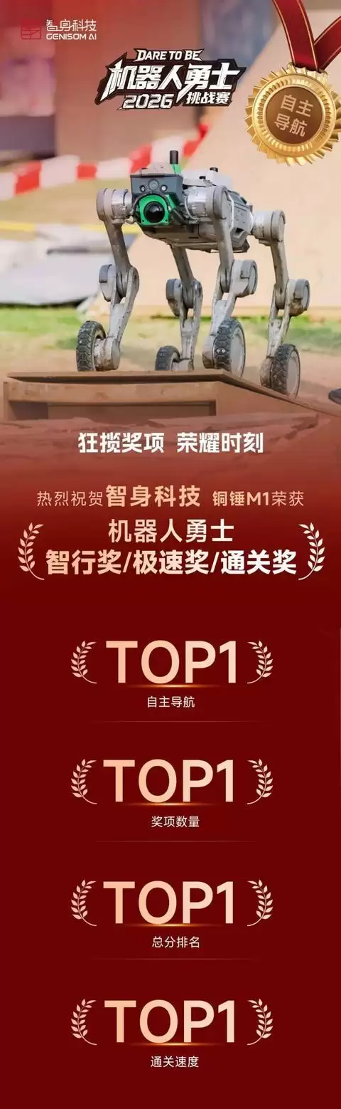 在这场顶尖竞技中,商业化领先企业智身科技(GENISOM AI)的表现尤为突出。他们以人形机器人“破风者RX”和四足机器人“铜锤”系列双阵容参赛,并且是唯一一支参与了勇士挑战赛全部三项赛事的队伍。其铜锤M1机器人一举包揽机器人勇士智行奖、通关奖、极速奖等六个奖项,在四足机器人大类中,实现了自主导航、奖项总数、总分、速度四个维度的全面领先。