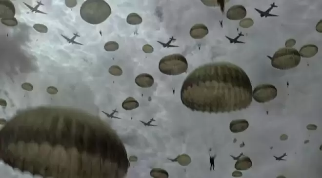 真实的战争从诺曼底上空开始。E连在D日夜间空降法国的段落,是影视史上对战场混乱最写实的描绘之一。黑暗、高射炮火、失控的伞降队形——士兵们落地即失散,在陌生地域依靠本能挣扎求生。没有壮丽的冲锋,只有孤立、迷茫与最原始的生存焦虑。这是《兄弟连》奠定的基调:对战争残酷性的零度粉饰。