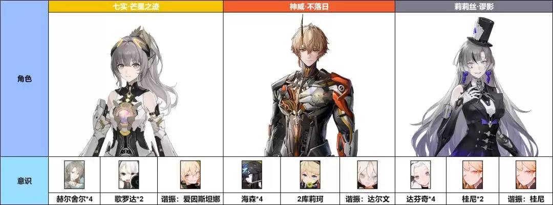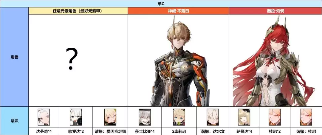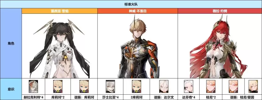 这是标准的轮切火队配置。不过对于配置不高(例如2S级别)的火队来说,有个优化思路:可以舍弃誓焰,让灼惘携带专属意识,与神威·不落日打双切配合,这样整体的输出效率往往会更高。