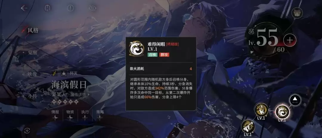 助战位: 务必选择海滩某某人,借助其技能范围广、伤害高的特点,高效清理前两场的成群敌人。
