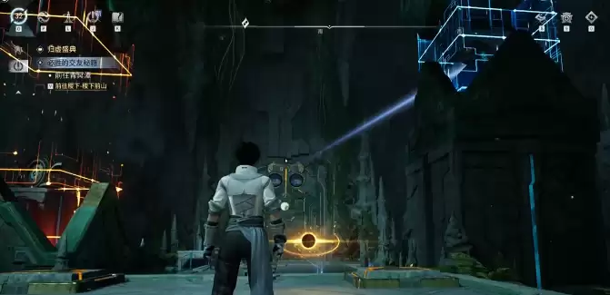 机关触发后,利用技能或路径飞到后方的柱子上,踩踏上面的机关。然后,只需耐心等待光线完成对接即可。