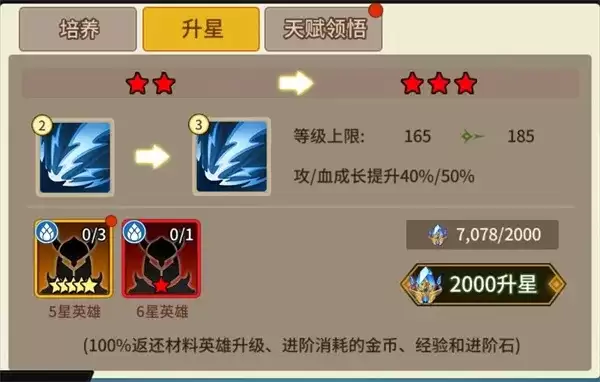从6星开始,进阶石正式加入消耗清单。材料组合变为:需要升星的6星卡1张,加上4张同系任意的5星卡。除此之外,你还得准备好1000个进阶石。