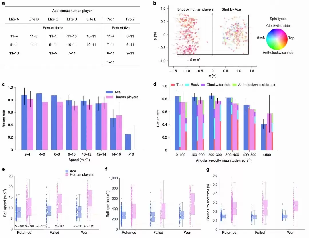 根据论文描述,Ace是在完全真实的场景下完成挑战的:遵循国际乒联(ITTF)规则,站在真实的球台旁,使用真实的球拍和乒乓球。它的对手是3位人类精英选手,结果Ace取得了胜利。更令人惊讶的是,在面对2位日本职业联赛(T.League)现役选手时,Ace在7局比赛中也成功拿下了1局。