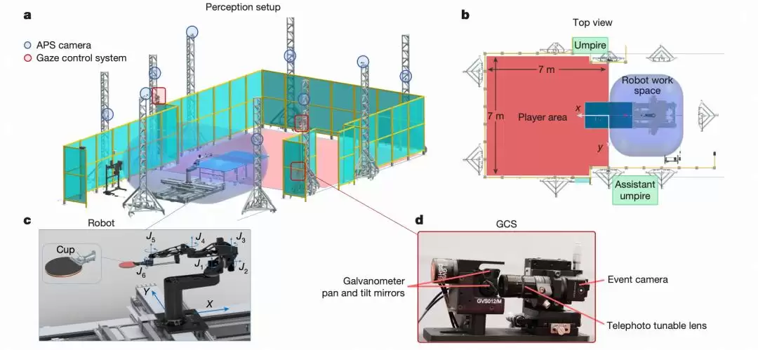 具体来说,球的3D位置由布置在球台周围的9台主动像素传感器相机测量,实现全场覆盖。而更关键的旋转信息,则由3套独立的“注视控制系统”负责。每套系统包含一台事件相机和一对反射镜,能主动跟踪球体,让事件相机始终“盯”着球,从而实时捕捉其旋转特征。