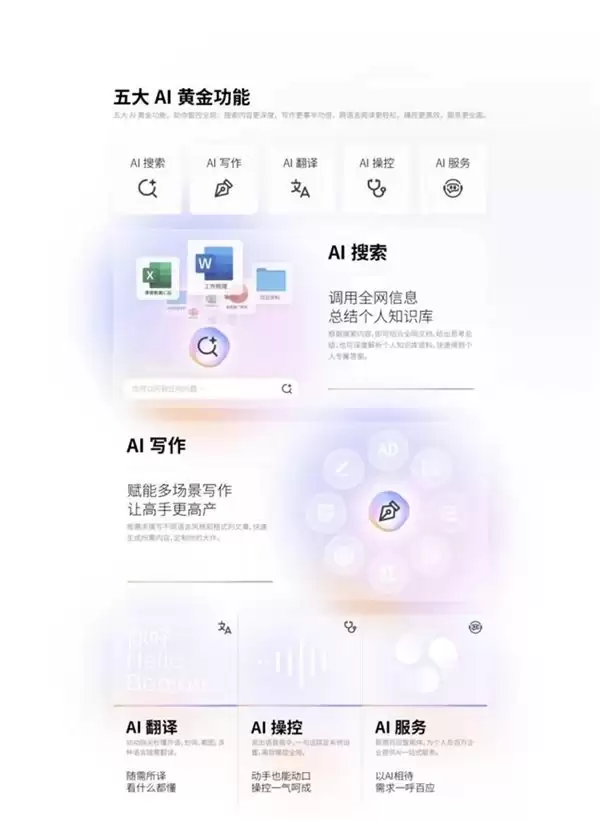 具体来看:AI操控功能允许你通过语音指令直接控制系统设置,动动嘴就能完成操作,解放双手。AI搜索功能则更懂职场人的信息焦虑,它能根据你的问题,结合全网及本地知识库进行深度解析,直接提供结构化的总结或答案,省去在海量信息中淘金的繁琐。