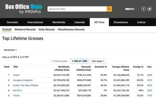 全球电影票房格局迎来关键性变动。权威票房统计平台BoxOfficeMojo数据显示,截至4月8日,《哪吒之魔童闹海》(《哪吒2》)全球累计票房已达22.67亿美元。凭借这一成绩,影片正式超越影史传奇《泰坦尼克号》,成功跻身全球票房总榜第四位。
