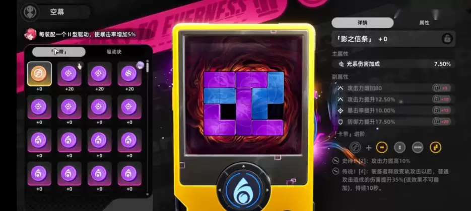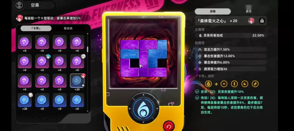 整个空幕系统的界面,酷似一台掌上游戏机,主要分为两大模块:“卡带”与“驱动”。卡带呈圆形,是套装效果的来源。你需要装备两片正确的卡带,才能激活对应的套装加成。而驱动则是提供基础属性的装备,按要求搭配特定组合(例如两件史诗加两件传说),还能解锁额外的增益效果。这两者相辅相成,缺了任何一部分,角色的属性都会大打折扣。