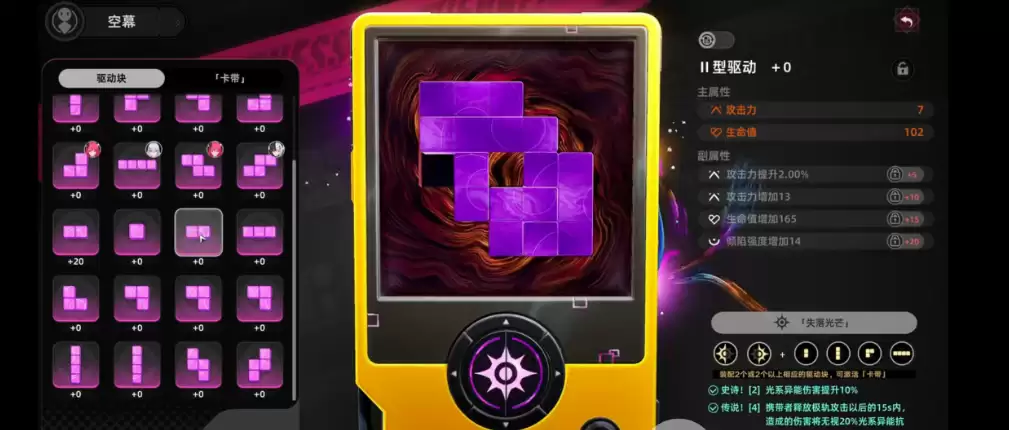 如果说驱动是“素材”,那么“拼放”就是空幕系统的核心玩法,也是最需要策略思考的环节。卡带和驱动在镶嵌时,遵循类似俄罗斯方块的拼接规则——必须严丝合缝地填满区域,才能获得完整的属性收益。此外,卡带的颜色还需与相邻驱动的颜色相匹配,搭配不当会导致效果衰减。初期自己摸索,可能会摆得杂乱无章,但熟悉规则后,或者参考一些成熟方案,其实就能很快上手。