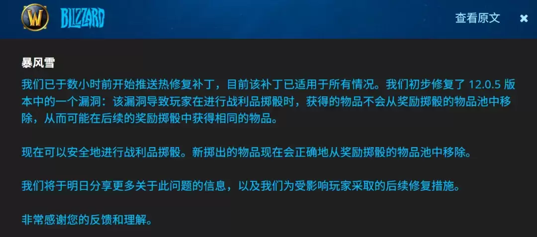 值得庆幸的是,暴雪已经紧急发布了修复蓝贴,目前重复Roll到相同装备的问题总算解决了。