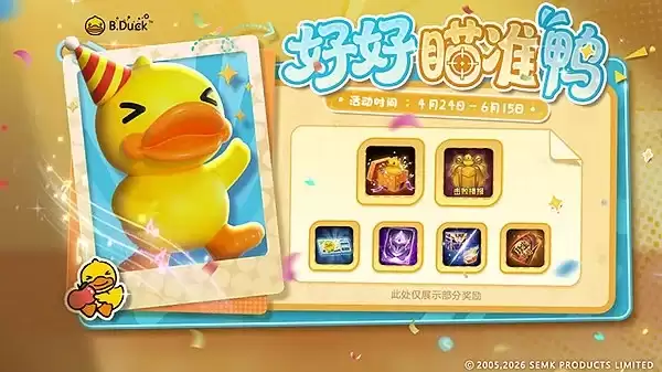 联动活动当然不止于海报。同步上线的“好好瞄准鸭”小游戏,玩法简单易上手,非常适合休闲时刻放松一下。活动将持续至6月15日,机会难得,可千万别错过。通过参与小游戏累计积分,玩家可以兑换包括“B.Duck小黄鸭联动皮肤幸运礼包”、“鸭鸭摩天轮欢乐券”、“史诗皮肤兑换卡”、“VIP月卡”,以及“骨龙/凤凰碎片”在内的诸多丰厚奖励。可以说,参与门槛低,但奖励回报却相当慷慨。