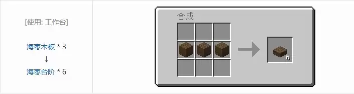 在工作台里,把三块海枣木板横着摆一排,就能得到六个海枣台阶。这个配方和原版大多数木质台阶的合成逻辑是一致的,上手毫无难度。记住这个“三合一得六”的公式,其他很多木质台阶你也就触类旁通了。