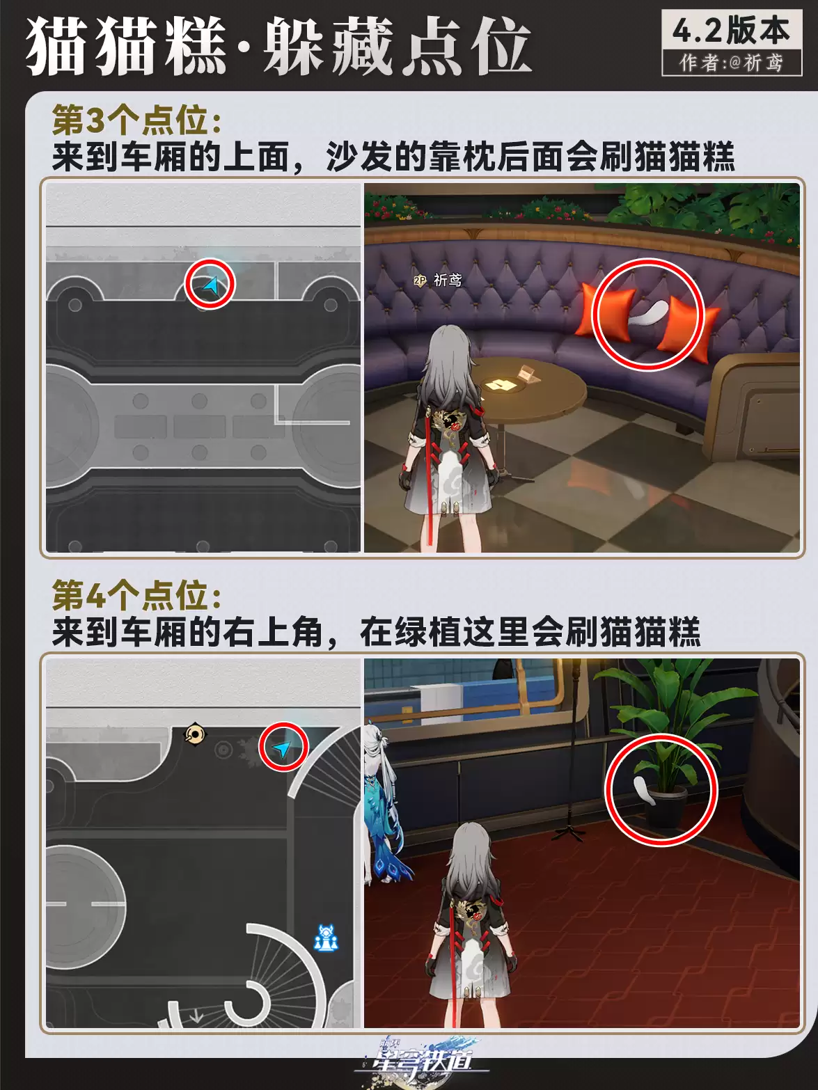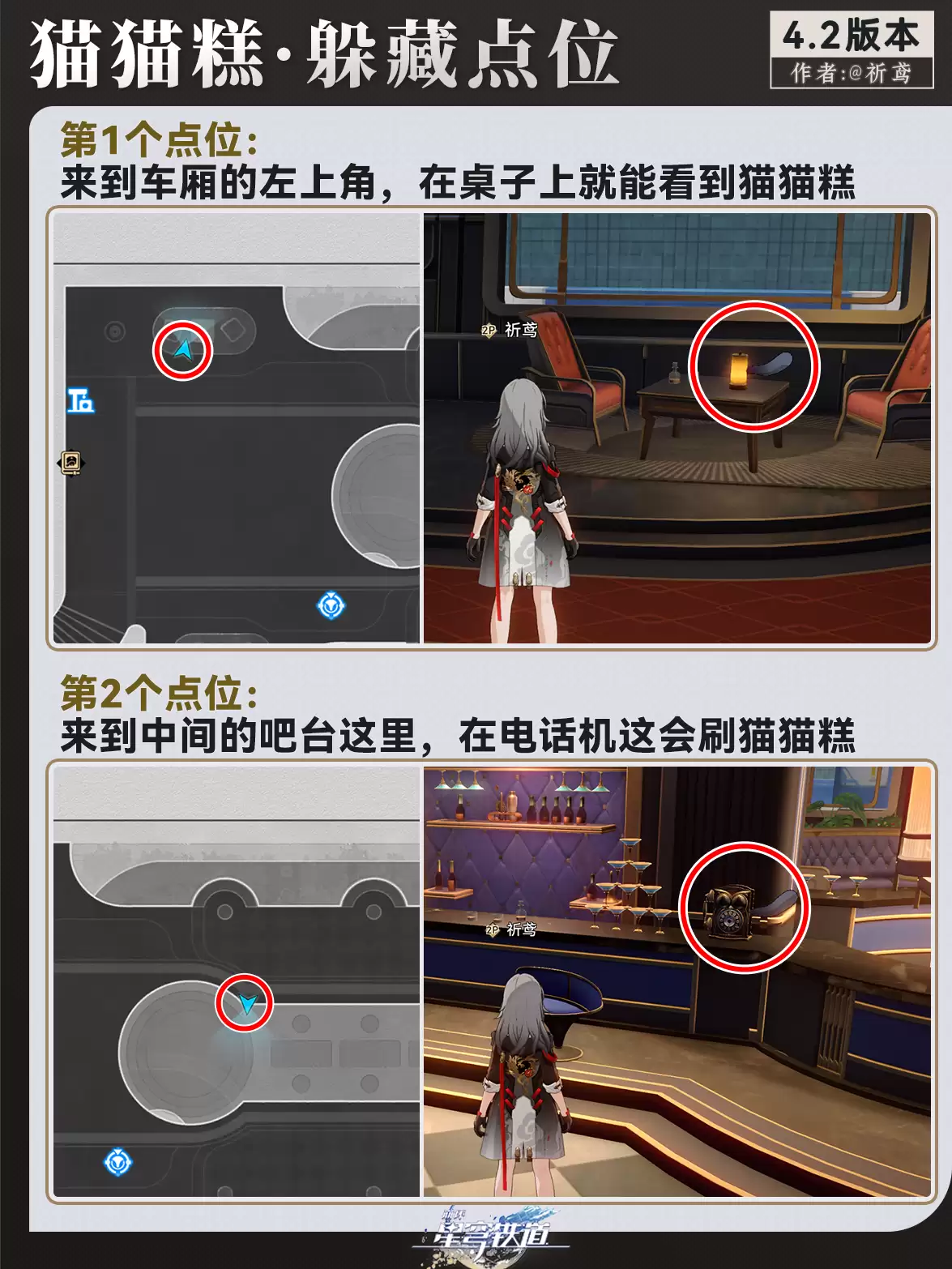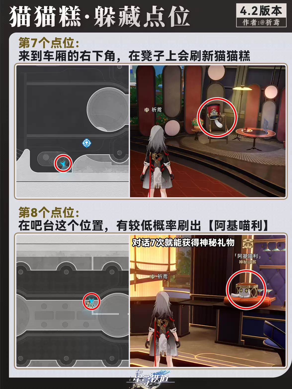 先说活动核心机制。“列车改造奇遇”这个玩法就固定在派对车厢里。每周,系统会随机刷新出3只猫猫糕,它们会藏在车厢的各个角落。如果你找得勤快,一周累计抓满9只不是问题。下面这张总览图,就是帮你锁定所有可能藏身点的关键。