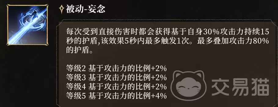 被动技能“妄念”提供了持续性的防护。每次受到伤害后,它能生成一个相当于30%攻击力的护盾,持续15秒,该效果每5秒只能触发一次。这个护盾的总量最高可以堆叠到攻击力的80%。重点是,这个数值会随着你攻击属性的提升而同步增长,真正实现了输出能力与生存能力的正向耦合,显著降低了操作时的容错压力。