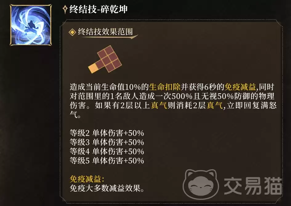 终结技“碎乾坤”,可以说是整套输出循环的绝对枢纽。释放时,它会先扣除10%的当前生命值,随即为角色提供6秒的减益免疫,并对单体目标造成高达500%的物理伤害,同时无视目标50%的防御。如果此时真气层数不少于2层,那么它会自动消耗2层,并立即回满所有怒气值。这个设计的精妙之处在于,它让连续释放终结技成为了可能——只要真气储备充足,你完全可以在短时间内打出两轮高额爆发,精准压制甚至秒杀敌方的关键单位。