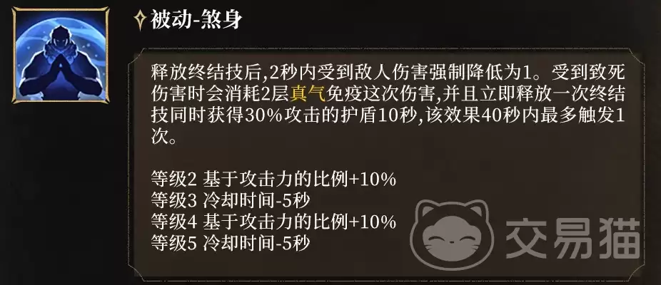 另一个被动“煞身”,则专注于极限生存。在释放终结技后的2秒内,所有受到的伤害都会被强制降低到1点。而如果遭遇了致死伤害,它会消耗2层真气来免疫这次致命打击,并立即反向释放一次“碎乾坤”进行反击,同时生成一个30%攻击力的护盾。这个强大的保命效果每40秒只能触发一次,是团战中实现逆转、绝处逢生的核心底牌。