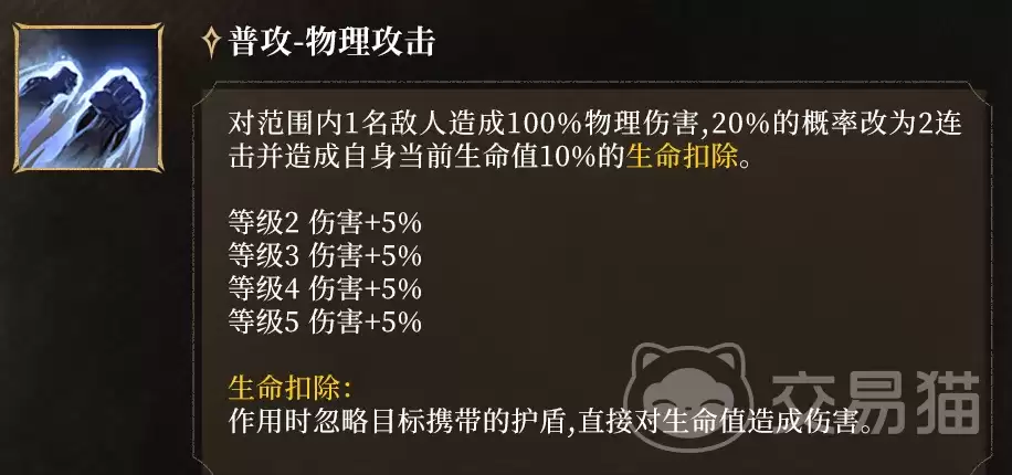 再来看看普通攻击。基础伤害是标准的100%物理攻击力,但附带一个20%概率触发的双段连击。这个效果有个代价:会强制扣除施放者当前生命值的10%,而且这个扣血无法被任何护盾抵消。听起来有点风险对吧?但恰恰是这个机制,成了激活他被动护盾的关键前置条件。所以,合理规划普攻频率,就能把生命损耗巧妙地转化为生存增益,形成一个攻防一体的闭环。
