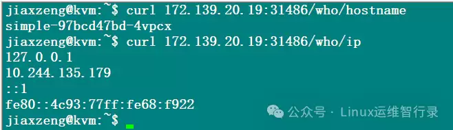 是骡子是马,拉出来遛遛。用 curl 访问对应的 NodePort 地址和端口,看看流量是否真的被正确路由到了后端的应用。