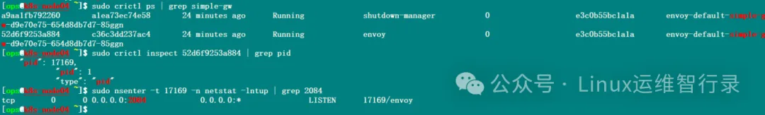 配置提交了,但生效了吗?最好深入容器内部确认一下。找到 Envoy 容器的进程 ID,然后检查端口监听状态,这是最踏实的方法。