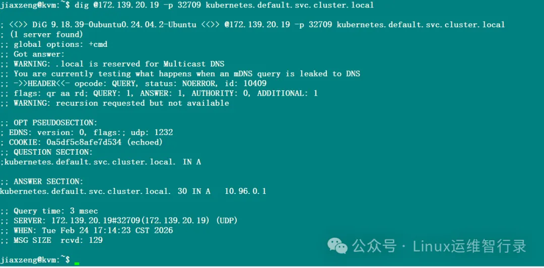 是时候验证 DNS 查询了。使用 `dig` 命令,指定我们刚刚暴露的地址和端口,查询一个集群内服务域名。