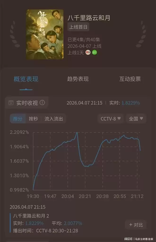 收视数据提供了最直接的反馈。酷云实时监测显示,《八千里路云和月》首集峰值收视率为2.2092%,第二集未能实现突破。这一成绩置于央八首播剧序列中,仅属中规中矩。抗日题材向来被视为收视保障,过往同类作品不乏亮眼表现。但本剧开局遇冷,其背后成因值得剖析。