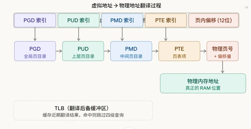 在Linux x86-64架构下,采用四级页表(PGD → PUD → PMD → PTE)结构。这意味着一次地址翻译最多可能需要四次内存访问。为了提速,CPU内部有一个TLB(翻译后备缓冲器)缓存最近的翻译结果。一旦命中,就能直接得到物理地址,完全跳过繁琐的四级查询。