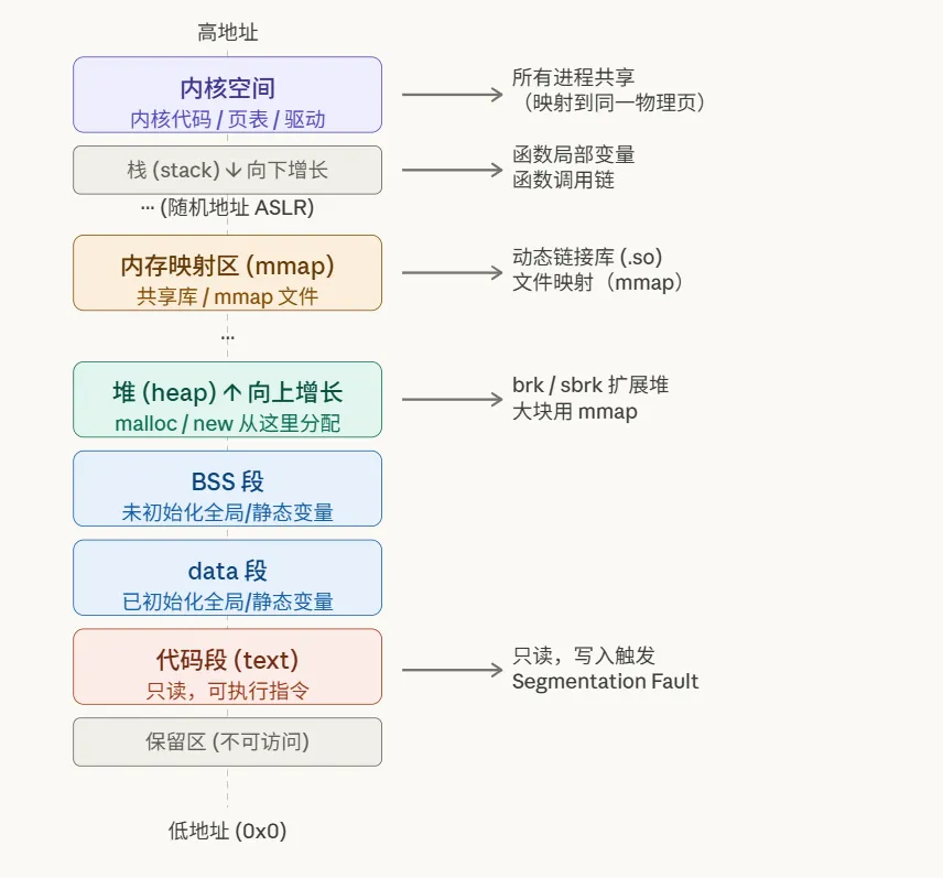 下面这张图清晰地展示了虚拟地址空间的完整布局: