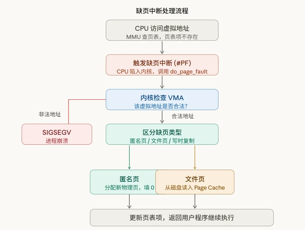 这套机制叫做缺页中断,堪称Linux内存管理最精妙的设计之一。