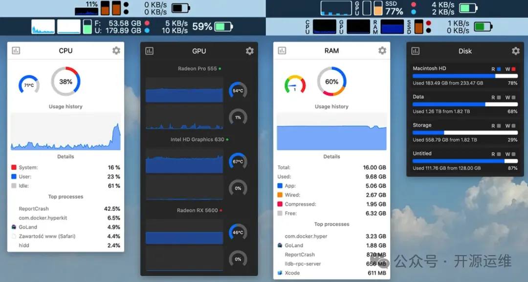 当然,Stats的能耐远不止基础监控。除了常见的CPU和内存,它还能显示GPU负载、磁盘读写活动,甚至读取传感器温度。电池模块不仅显示剩余电量,还会提示电池健康状态。对于希望深入了解设备运行细节的用户来说,这些信息无疑极具价值。