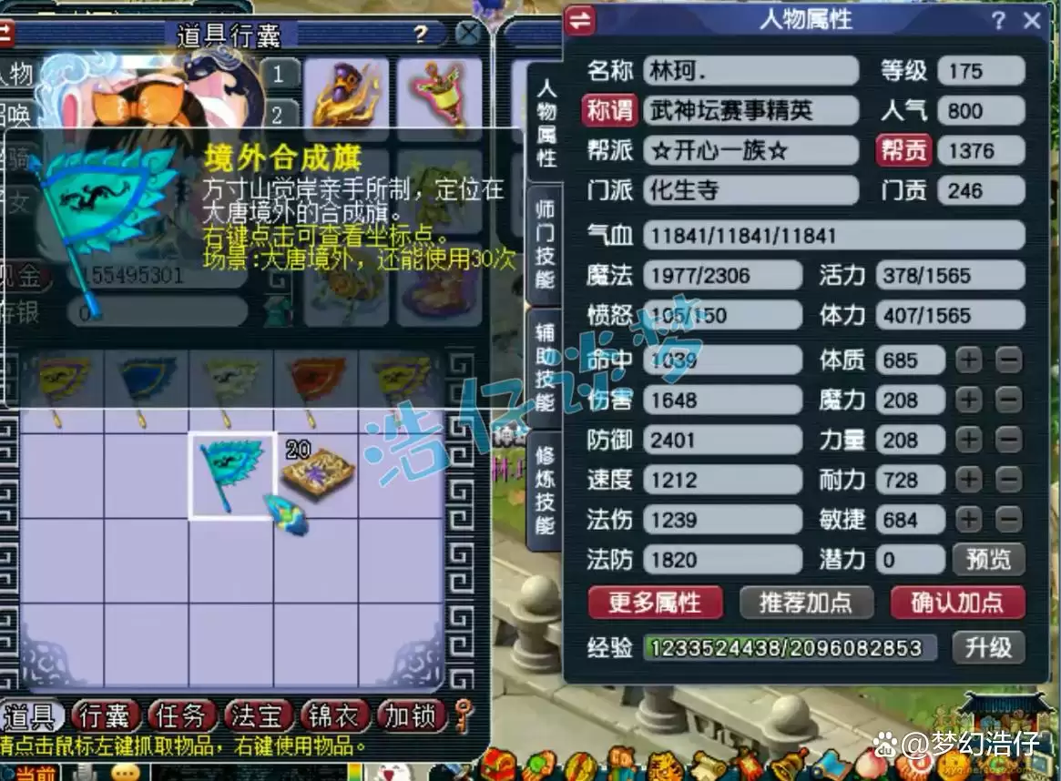 先来看看打符后的面板属性。气血和防御的数值或许不算顶尖,但请注意那高达1820的法术防御——这在实战中意味着极强的法术抗性。再配上“武神坛精英”这个称谓,角色的整体实力如何,其实已经不言而喻了。