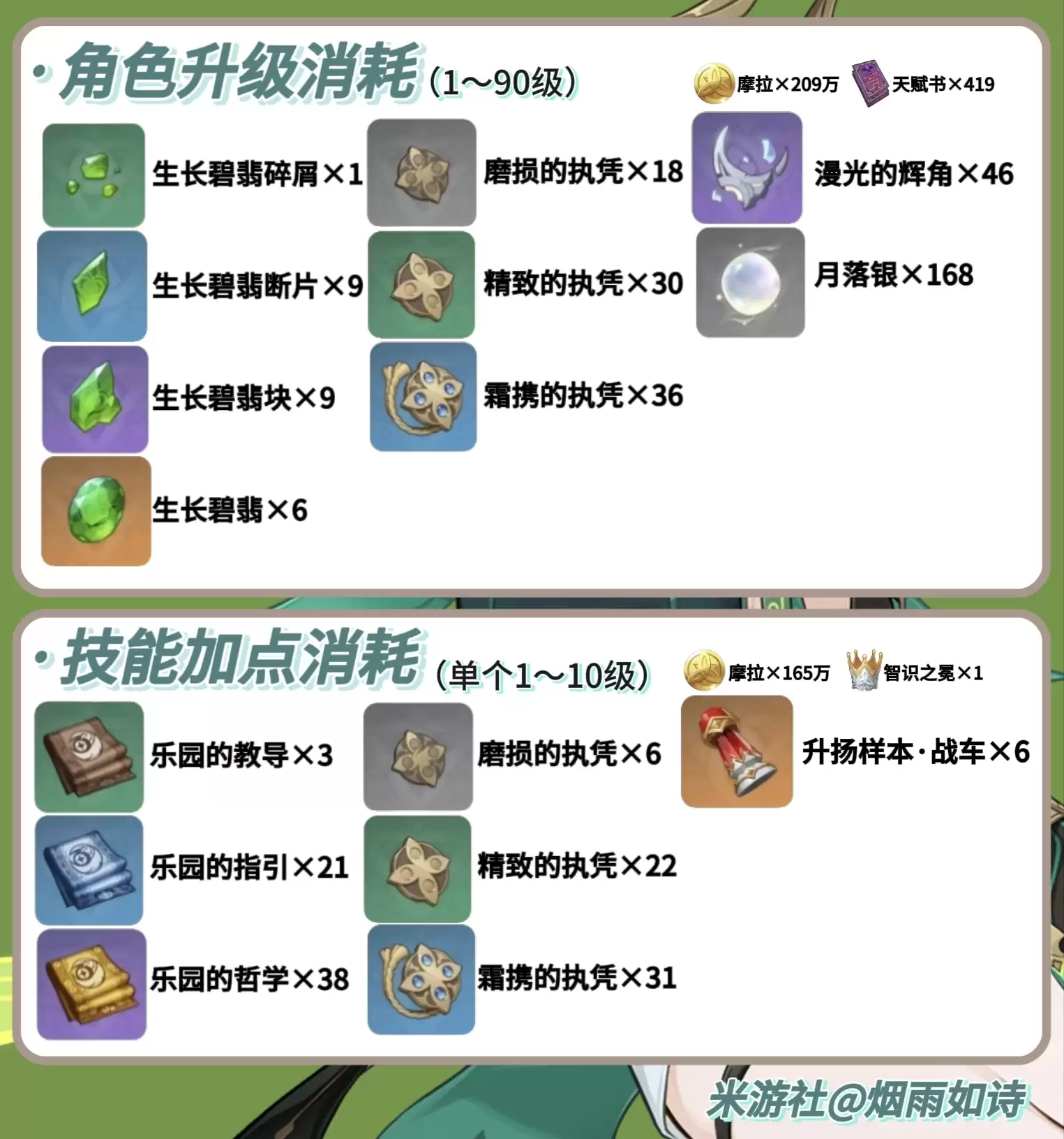天赋等级是决定角色实战上限的关键。请注意,这里列出的是单个天赋从1级升到10级(或相应最高等级)的消耗总量,三个天赋全拉满需要准备三份: