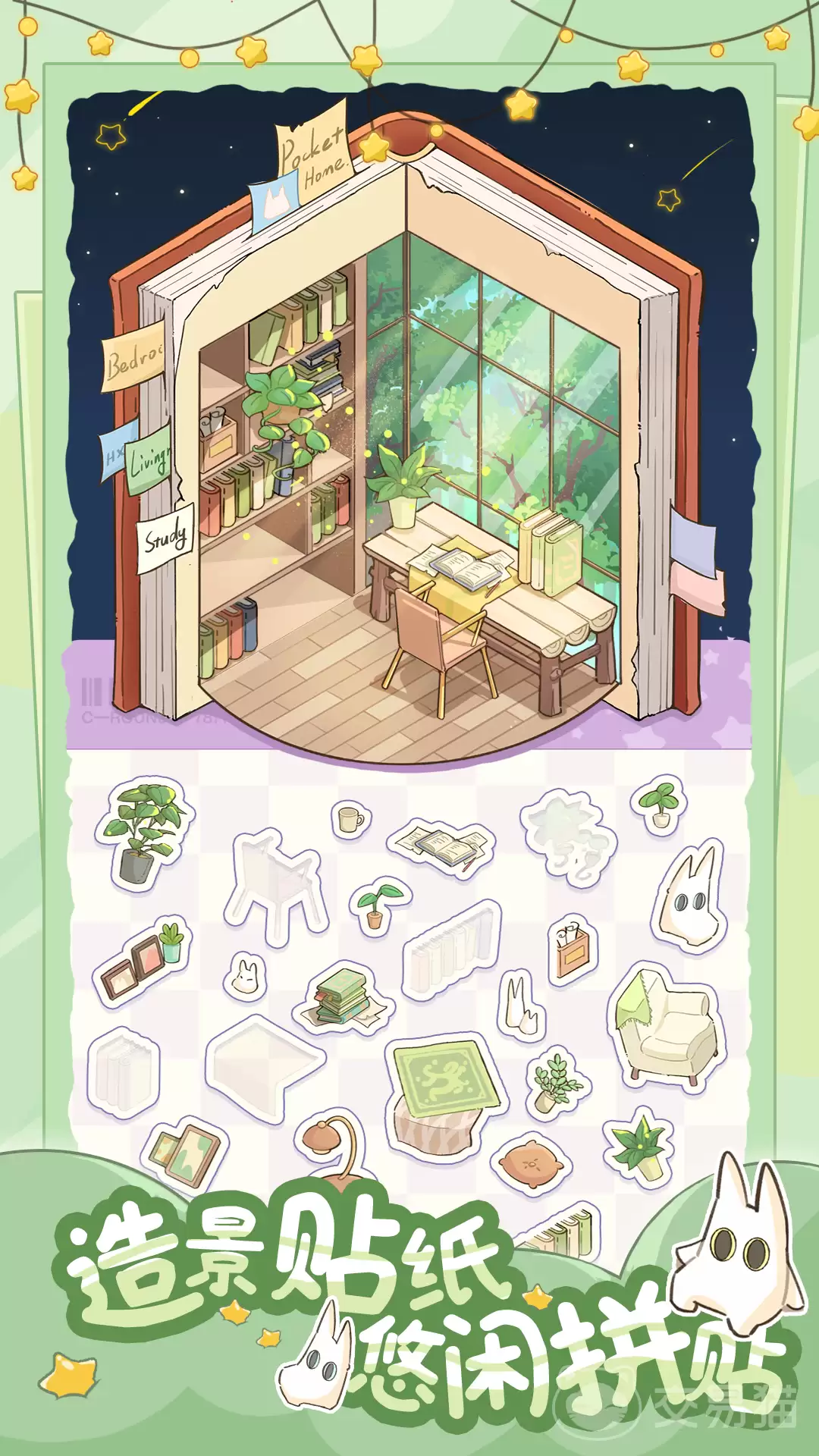 美术风格是这款游戏的一大亮点。整体采用低饱和度的水彩手绘风格,每一张贴纸均为原创绘制,单张纹理的细腻度甚至达到了高清印刷标准。游戏提供了卧室、书房、花园、占卜屋四大主题场景模块,它们分别对应着温馨、静谧、清新、神秘四种截然不同的情绪基调,让玩家可以根据当下心境自由选择创作的起点。