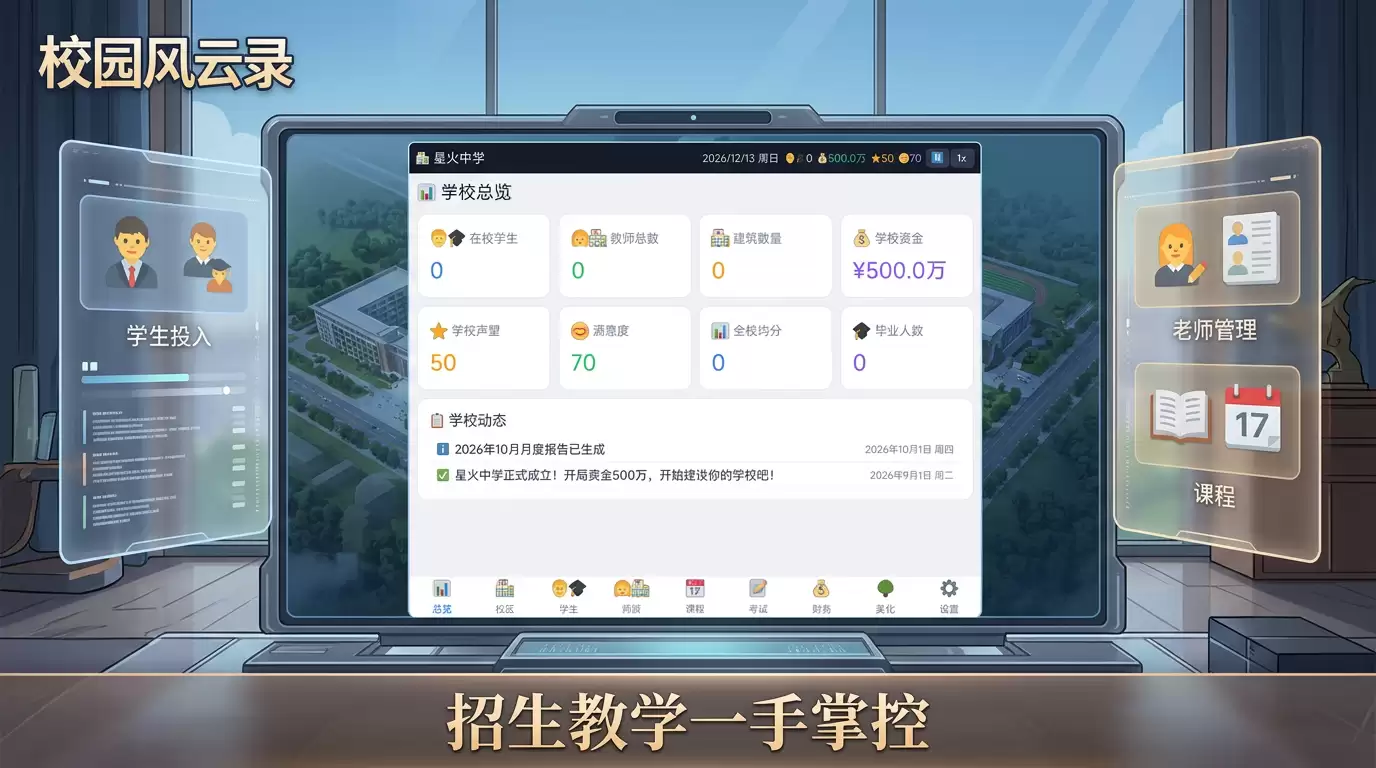 简单来说,这是一款沉浸感十足的校园经营模拟游戏。在游戏中,你将化身为一名校长,全面执掌学校的运营大权。从招生宣传、课程设置,到财务管理、师资招聘,再到校园的扩建与美化,所有决策都落在你的肩上。你的目标很明确:通过合理规划课程、招募顶尖教师、不断升级校园设施,一步步打造出你心目中那个独一无二的理想学府。