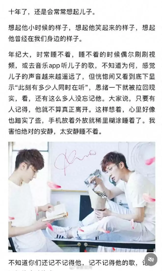 十年过去,伤痛并未真正退场。老两口透露,年纪大了常失眠,睡不着时就刷刷视频,或外放儿子的歌,这样才可能“稀里糊涂睡着”。他们所承受的远不止丧子之痛:网络暴力曾如影随形,后来出现的“AI复活”视频,更造成了二次伤害。此次他们选择公开儿子生前受抑郁症折磨的细节——失眠、身体僵硬、被网暴——用意明确:以最直接的方式,平息外界无端的猜测与流言,让逝者真正安息。
