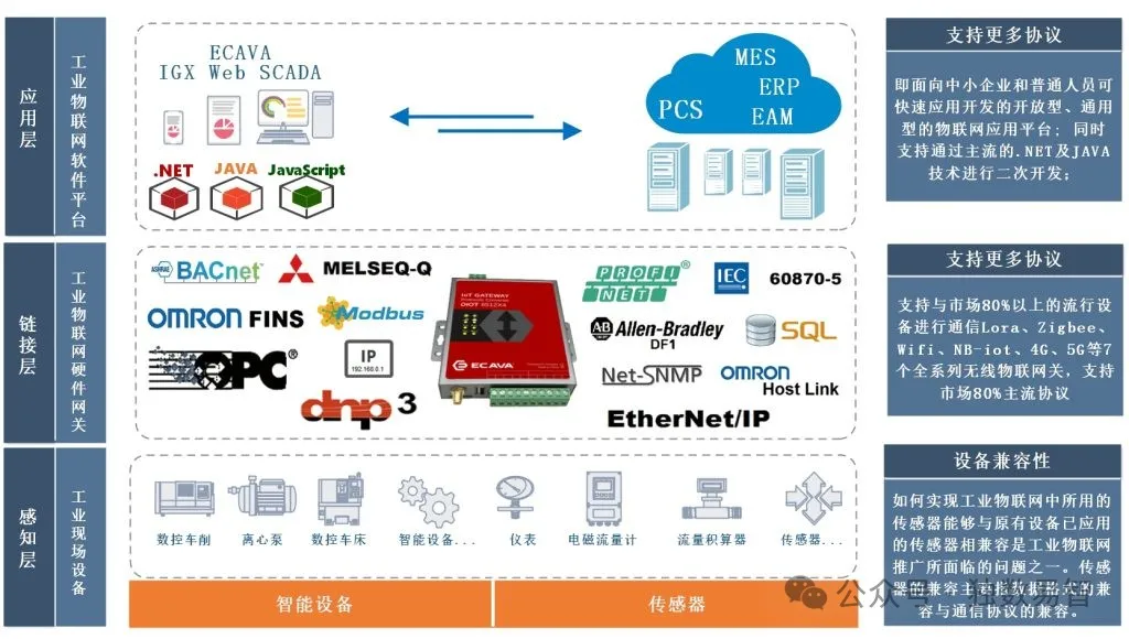 其典型架构分为三层:感知层作为系统的“感官末梢”,直接采集温度、压力、振动等原始工况数据;网络层充当“传输通路”,通过工业协议与网络确保数据稳定、低延迟地汇聚;而应用层则负责价值转化,将数据流转化为可执行的工艺洞察与控制指令。实现万物互联在提升产线柔性同时,也对工业网络的安全架构与数据治理提出了更高要求。