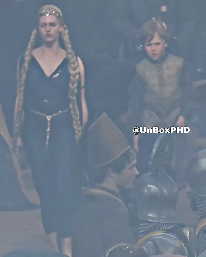 从曝光的画面来看,饰演玛莉卡的演员人选堪称惊喜。英国演员艾玛·莱尔德将化身这位黄金律法的缔造者。她在片中的戏份显然不轻,被拍到与多位关键角色互动。其中一张照片尤其引人遐想:玛莉卡身边,竟跟着一名头生犄角的幼童。熟悉游戏设定的玩家一眼就能看出,这极有可能是年幼时期的蒙葛特——那位日后被称为“孤王”、誓死守卫黄金树的悲情人物。这个细节几乎明示了,电影将把我们带回到那个看似辉煌、实则暗流涌动的黄金时代,去窥探玛莉卡与她的子嗣们,在神权、命运与即将到来的崩坏面前,究竟经历了什么。