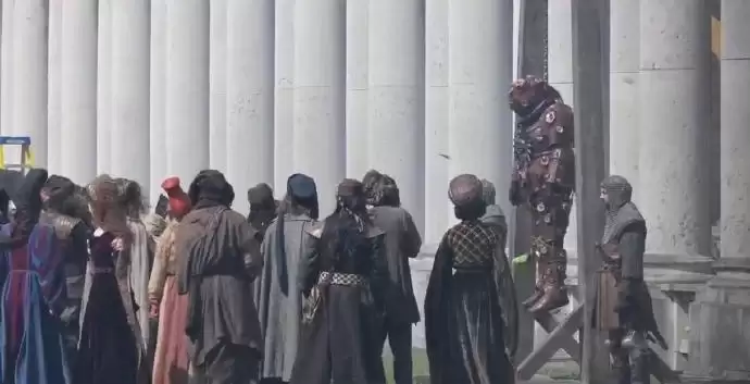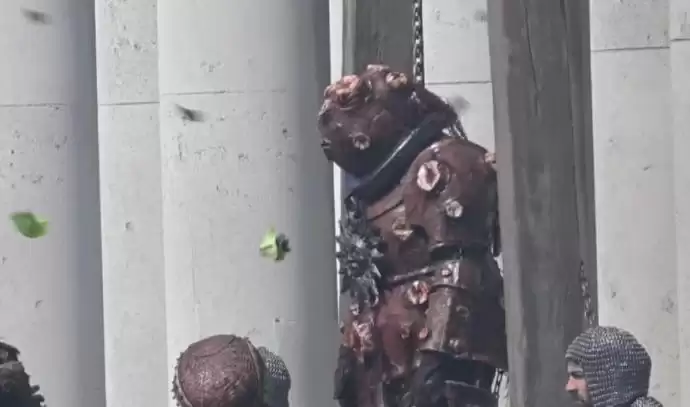 当然,片场照的“猛料”远不止于此。另一个让玩家们瞬间沸腾的角色也现身了——“食粪者”。照片还原了游戏中那令人不适又印象深刻的行刑场景:这个角色被高高悬吊,围观的民众正向他投掷污物,那身锈蚀的盔甲造型可谓神还原。但更关键的信息在后面:有泄露指出,玛莉卡女王曾亲自探访过被囚禁的“食粪者”。这可是游戏原作中未曾记载的原创情节。这一笔添加得相当大胆,或许正是为了给这个极端反派的动机,乃至整个交界地的黑暗面,提供一个全新的、更具深度的叙事视角。